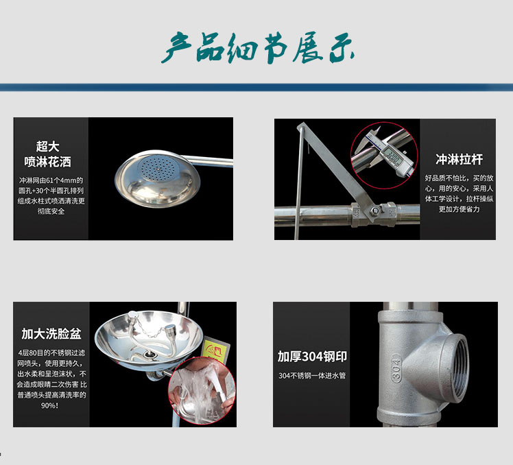 產(chǎn)品簡(jiǎn)介:洗眼器是當(dāng)發(fā)生有毒有害物質(zhì)(如化學(xué)液體等)噴濺到工作人員身體、臉、眼或發(fā)生火災(zāi)引起工作人員衣物著火時(shí),用于緊急情況下,暫時(shí)減緩有害物對(duì)身體的進(jìn)一步侵害,進(jìn)一步的處理和治療需要遵從醫(yī)生的指導(dǎo),避免或減少不必要的意外。